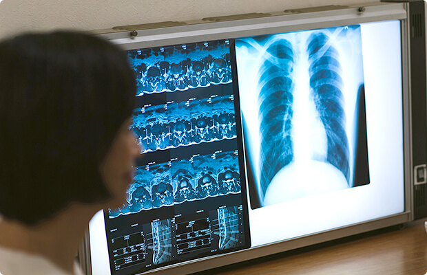 胸部エックス線検査では、ネックレス、湿布、磁気製品、プリント付きシャツ、ワイヤ-や金属、プラスチックのついた下着等は撮影前にお取りください。