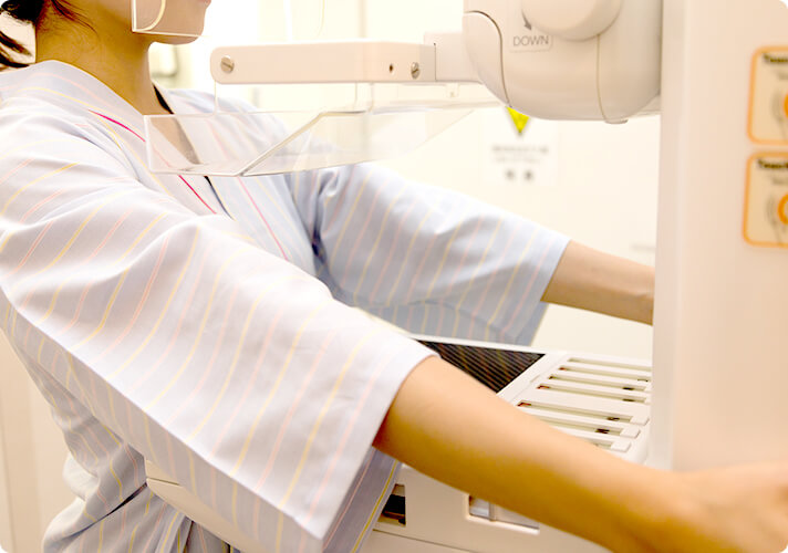 - 乳房専用のエックス線検査です。しこりや石灰化した微小な乳がんを発見します。