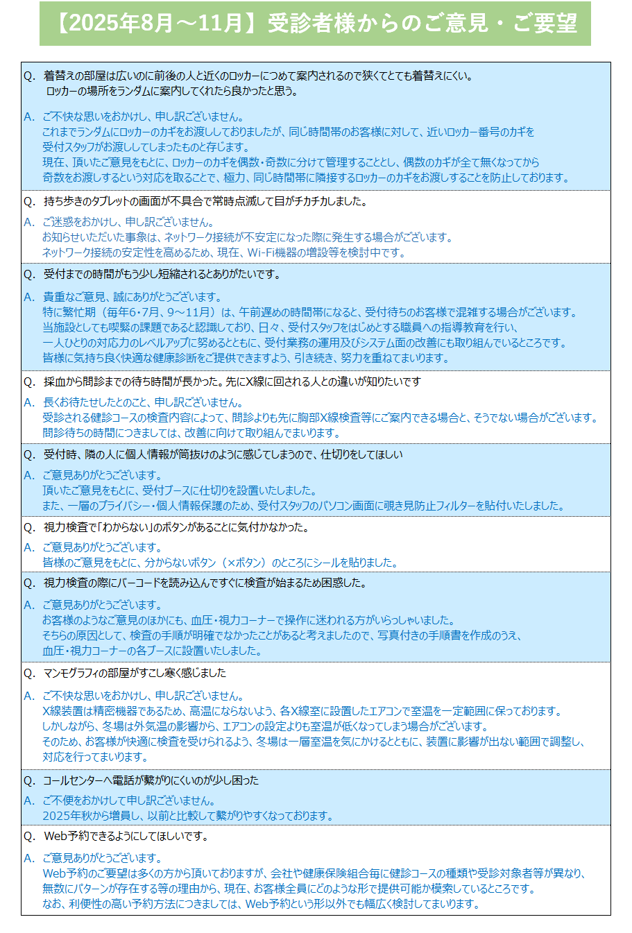 【2025年8月~11月】受診者様からのご意見・ご要望について(ガーデンシティ健診プラザ)