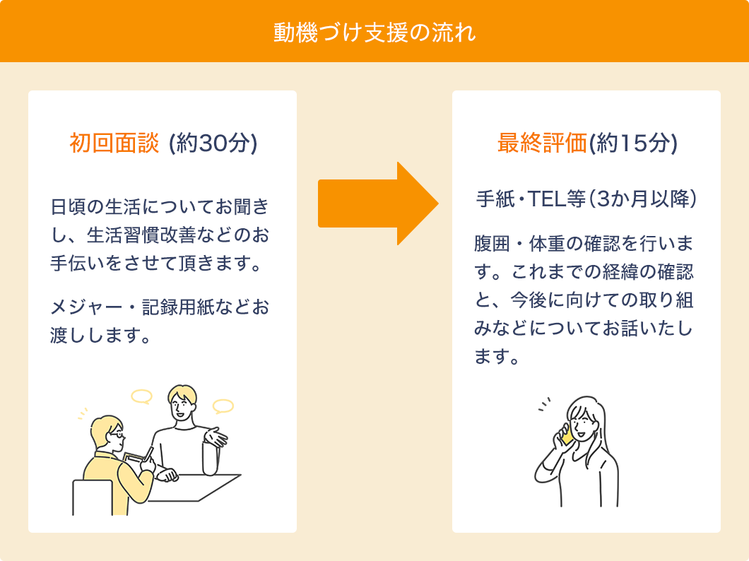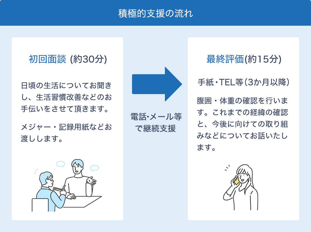 当機構では専門の保健師・管理栄養士等が保健指導を担当し、健診の結果から身体の変化に気づいていただき、一緒に生活習慣を振り返ります。その中で個々の状態に合わせた生活習慣の改善目標を設定し、日ごろの生活の中で実践できるように、支援していきます。