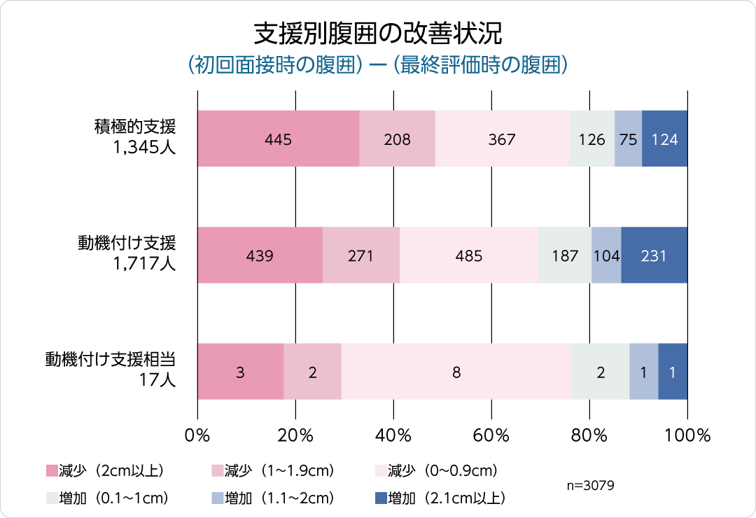 腹囲は、 1cm以上減少者が積極的支援は約5割、 動機づけ支援は約4割、 動機づけ支援相当は約3割でした。